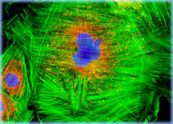 A culture of rat thoracic aorta cells was fixed, permeabilized, and blocked with 10-percent normal goat serum in phosphate-buffered saline prior to immunofluorescent labeling with rabbit primary antibodies to giantin, a protein resident in the Golgi complex of mammalian cells. The culture was subsequently stained with a mixture of goat anti-rabbit secondary antibody fragments (heavy and light chain) conjugated to Cy2. In addition, the cells were labeled with Alexa Fluor 568 conjugated to phalloidin (targeting the filamentous actin network), and for DNA with Hoechst 33342.