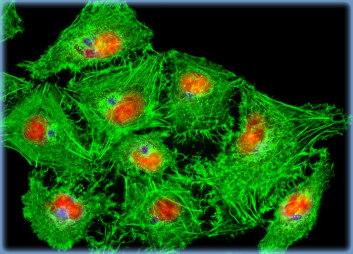 The adherent culture of human carcinoma (A-549) cells illustrated in this section was stained with Alexa Fluor 350 conjugated to wheat germ agglutinin for the Golgi apparatus, as well as Alexa Fluor 488 conjugated to phalloidin for cytoskeletal actin. Nuclei were labeled with the intercalating dye, propidium iodide.