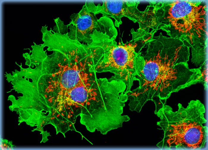 A culture of COS-7 fibroblasts was labeled for mitochondria with MitoTracker Red CMXRos, and for the cytoskeletal filamentous actin network with Alexa Fluor 488 conjugated to phalloidin, a cyclic peptide derived from the toxic death cap fungus (Amanita phalloides). In addition, the fibroblasts were counterstained for DNA in the cell nucleus with Hoechst 33258.