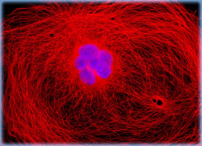The African green monkey kidney (COS-7) fibroblast cell that appears in this section was resident in a culture that was immunofluorescently labeled with primary anti-tubulin mouse monoclonal antibodies followed by goat anti-mouse Fab fragments conjugated to Cy3, targeting the extensive cellular microtubular network. The culture was also stained for DNA with the ultraviolet-absorbing probe DAPI.