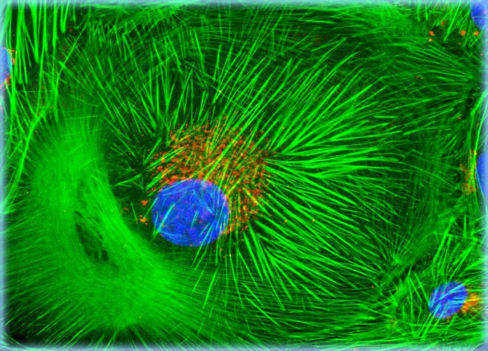Reviewed in this section is a culture of African green monkey kidney fibroblast cells that was stained with Alexa Fluor 488 conjugated to phalloidin, which binds to the intracellular filamentous actin network. The cells were subsequently stained with DAPI (targeting DNA in the cell nuclei) and the lectin, wheat germ agglutinin, conjugated to Texas Red (targeting glycoproteins in the Golgi complex).