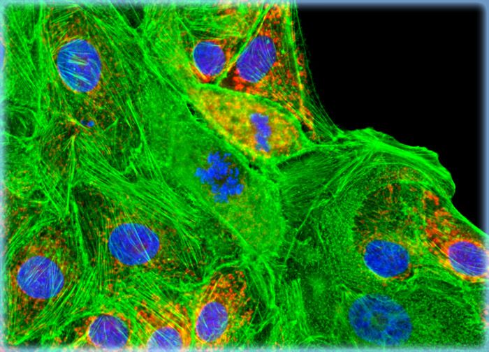 An adherent culture of Madin-Darby canine kidney cells was labeled for the intracellular mitochondrial network and for filamentous actin with MitoTracker Red CMXRos and Alexa Fluor 488 conjugated to phalloidin, respectively. The ultraviolet-absorbing probe DAPI was utilized to counterstain DNA.
