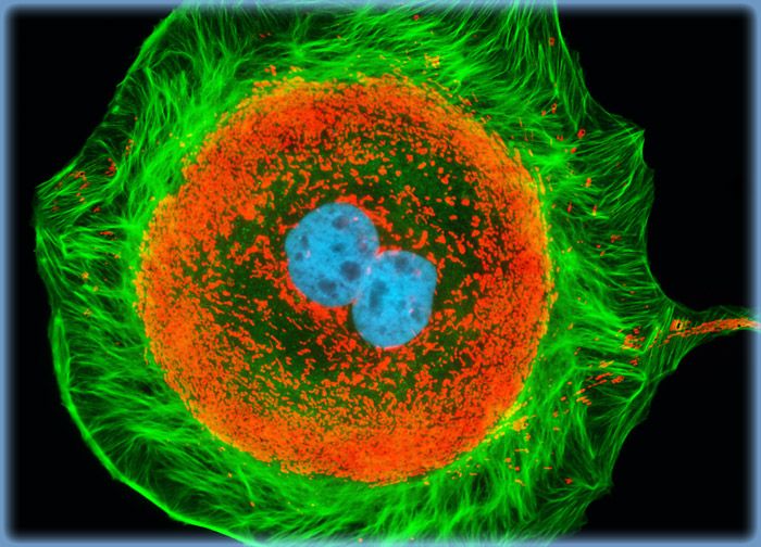 The popular dye combination of MitoTracker Red CMXRos, Alexa Fluor 488 conjugated to phalloidin, and Hoechst 33342 were utilized to stain an adherent culture of Madin-Darby ovine kidney epithelial cells. This triple probe regimen labels the tubular mitochondria, filamentous actin network, and DNA in the nucleus.