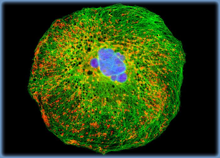 A culture of sheep kidney cells (MDOK line) was immunofluorescently labeled with primary anti-tubulin mouse monoclonal antibodies followed by goat anti-mouse Fab fragments conjugated to fluorescein. The cells were simultaneously probed for DNA with the ultraviolet-absorbing probe Hoechst 33258, and for the mitochondrial network with MitoTracker Red CMXRos.