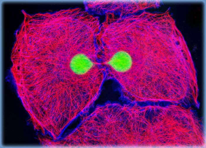 Immunofluorescence with mouse anti-alpha-tubulin was employed to visualize distribution of the microtubule network in dividing Madin-Darby ovine kidney epithelial cell cultures. The secondary antibody (goat anti-mouse IgG) was conjugated to Alexa Fluor 568 and mixed with Alexa Fluor 350 conjugated to phalloidin to simultaneously image tubulin and the actin cytoskeleton. Nuclei were counterstained with SYTOX Green.