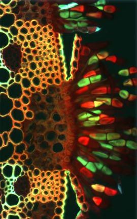 The photomicrograph below is a fluorescence image of a stained thin section of wheat showing a brick-red pustule captured erupting from the leaf surface. Wheat rust is a common and serious disease, reducing crop yields both in the United States and in other wheat-growing areas of the world. The disease is caused by a parasitic fungus and can affect both the leaf and stem of wheat plants.