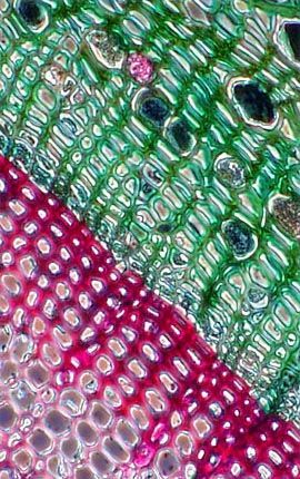 The photomicrograph above illustrates a stained thin section of vascular plant stem imaged with phase contrast illumination. Tracheids are nonliving cells found in the xylem of the more ancient plant types, seedless vascular plants (ferns, club mosses, and horsetails) and gymnosperms (cedar, pine, and cypress trees).